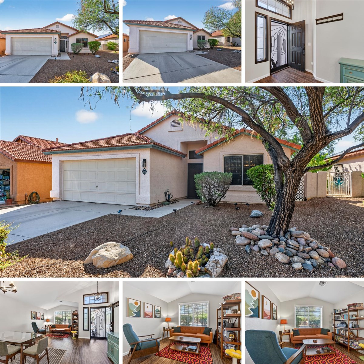 Nestled within the desirable Rancho Vistoso community of Oro Valley, this stunning 3-bedroom, 2-bathroom home offers the perfect blend of modern luxury and serene desert living. Situated just moments from Wildlife Ridge Park, the home welcomes you with an expansive living and dining room combination that sets a sophisticated tone upon entry. The heart of the home features a beautifully updated kitchen boasting newer white cabinetry, black hardware, a sleek gas stove, island seating, and a dedicated coffee nook. This space flows seamlessly into a family room anchored by a cozy gas fireplace, all highlighted by updated flooring and contemporary decorative tile throughout the home. The split-bedroom floor plan ensures maximum privacy.