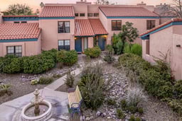 Come home to a functional floorplan full of charm! Make your way past the fountain courtyard and into your Haven! Saltillo tile, blue hues, custom tile accents throughout and crisp paint- all come together to welcome you into comfort and peace. Bright living room with corner wood-burning fireplace, spacious dining area and a lovely kitchen which features Quartz with recycled glass countertops, electric range, microwave/convection oven combo, dual sink, water filtration and a gorgeous custom backsplash. Top down/bottom up windows in entire home contribute to fresh air circulation minus the dust- inward opening mechanism allows for easy cleaning plus Milgard has a lifetime transferrable warranty!! These were installed in 2017 at a cost of $18k. The custom topdown/bottom up blinds contribute to privacy while filtering our eternal sunshine.