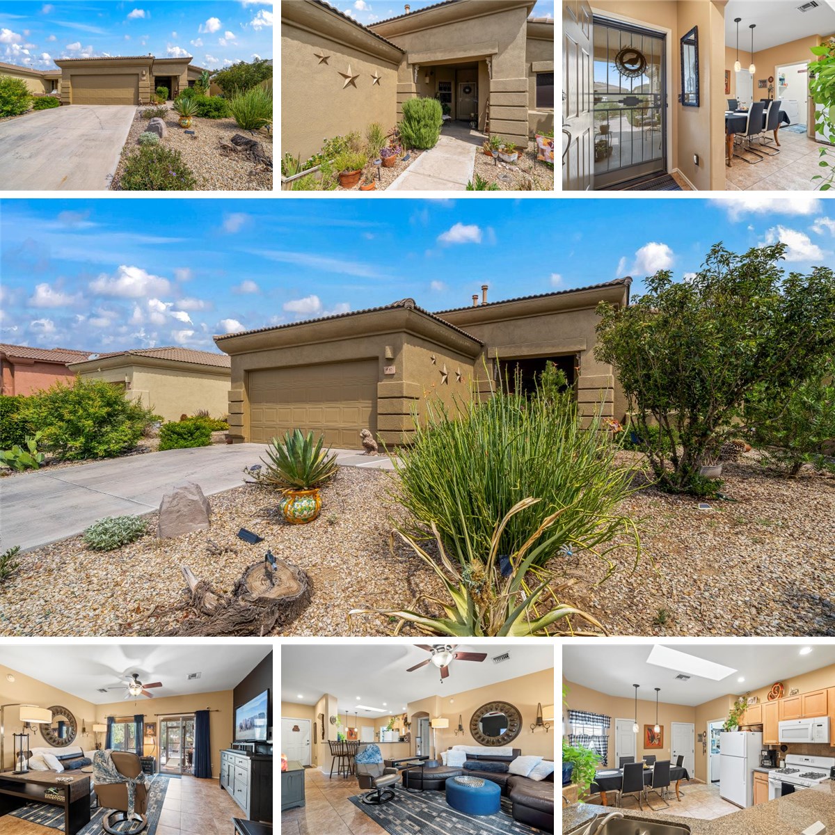 Discover comfort & style in this inviting Rancho Abrego 2 home with no GVR. The open floor plan & tile flooring throughout create a bright, easy-care living space. The kitchen shines with solid-surface counters, tile backsplash, & gas range. Relax in the screened Arizona room overlooking lush landscaping, fruit trees, a fire pit, & partial mountain views. Thoughtful features include ceiling fans, walk-in closets, sliding patio doors, & a Kinetico water softener. Freshly painted exterior & new hot water heater in 2023 add peace of mind. Enjoy the neighborhood park right across the street, with shopping & dining just minutes away. This quality built Pepper Viner home is move in ready & won't disappoint!